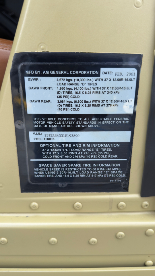 2001 AM General Hummer 4-Passenger Wgn Enclosed